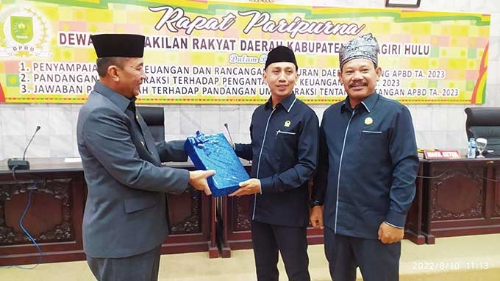 Wakil Bupati Inhu Drs. H. Junaidi Rachmat MSi  menyampaikan nota keuangan dan rancangan peraturan Daerah tentang APBD 2023, Wabup juga menyampaikan terima kasih kepada Pimpinan DPRD Kab Inhu dan Anggota DPRD yang telah menyampaikan kebijaksanaan umum Prioritas Plafon anggaran sementara (KUA-PPAS) tahun 2023. secara umum nota keuangan APBD Inhu tahun 2023 bersumber dari pendapatan daerah sejumlah Rp1,2 triliun, yang bersumber dari PAD Rp 137 miliar dan di tambah silva tahun lalu sehingga RAPBN Inhu 2023 dapat mencapai Rp1,5 triliun ujar Wakil Bupati Inhu.