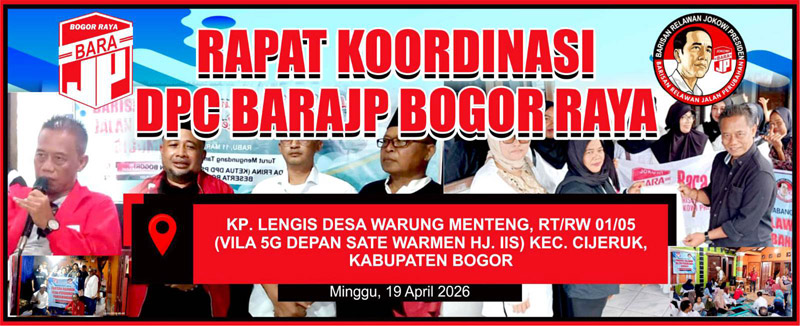Terbaru ini, BaraJP Bogor Raya melakukan deklarasi dan pengukuhan Pimpinan Anak Cabang (PAC) dan ranting se Kecamatan Cijeruk, di Villa 5G, Depan Warung Sate Warmen Hj. Iis, Kp. Lengis, Desa Warung Menteng, Kabupaten Bogor, Minggu (19/4/2026).