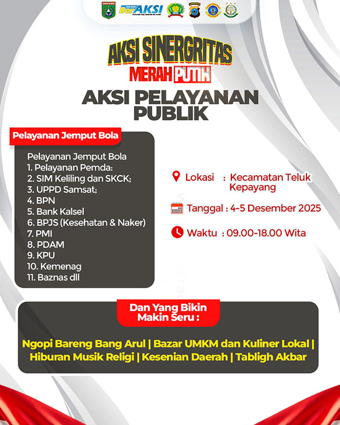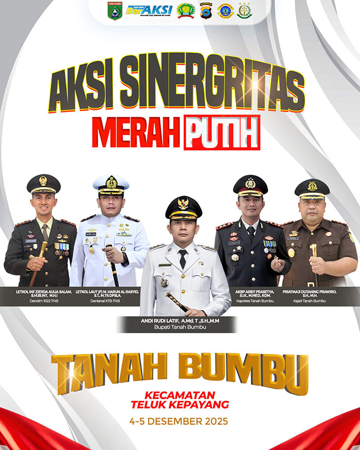 TANAH BUMBU, – Pemerintah Kabupaten Tanah Bumbu (Pemkab Tanbu) Kembali melaksanakan Aksi Sinergitas Merah Putih, kali ini digelar di Kecamatan Teluk Kepayang, Kabupaten Tanah Bumbu, pada Kamis-Jumat, 4-5 Desember 2025.