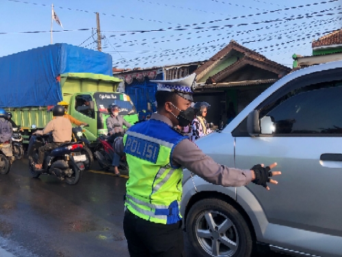 Anggota Unit lalu lintas Polsek Batujajar AKP Tarmubi Antensi melaksanakan pemantauan lalulintas di Depan mako dan di Pos Gatur Cangkorah, Graha Kencana pada Sabtu (6/5/2023) dimulai pukul 07.00 WIB.