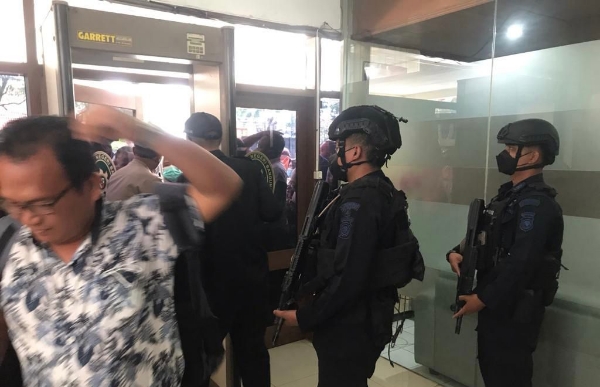 Dalam melaksanakan tugasnya, Aipda Hadi Mustofa dan rekan kerjanya semua mengenakan rompi dan membawa senjata laras panjang.