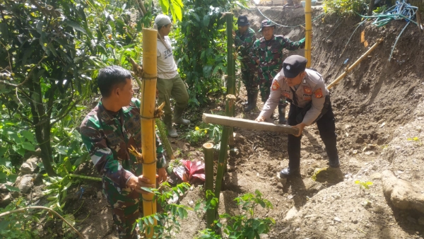 Majalengka,-Untuk mengantisipasi Terjadi kembali bencana alam tanah longsor Sinergitas Polsek Maja Polres Majalengka Polda Jabar dan Koramil Maja bersama Masyarakat melakukan Kerja Bakti di Blok Pasir Desa Nunuk Baru Kecamatan Maja Kabupaten Majalengka, Senin (6/3/2023).