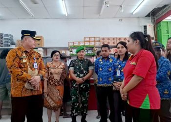 SORONG,-- Pj. Wali Kota Sorong, Dr. Bernhard Eduard Rondonuwu, S.Sos., M.Si., bersama Forkopimda Kota Sorong meninjau harga dan ketersediaan sembako...