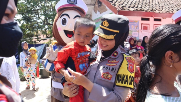 Polisi bahkan menghadirkan badut zebra dari Sat Lantas Polres Cianjur, bernyanyi bersama, main tebak-tebakan, dan memberikan hadiah kepada anak-anak tersebut.