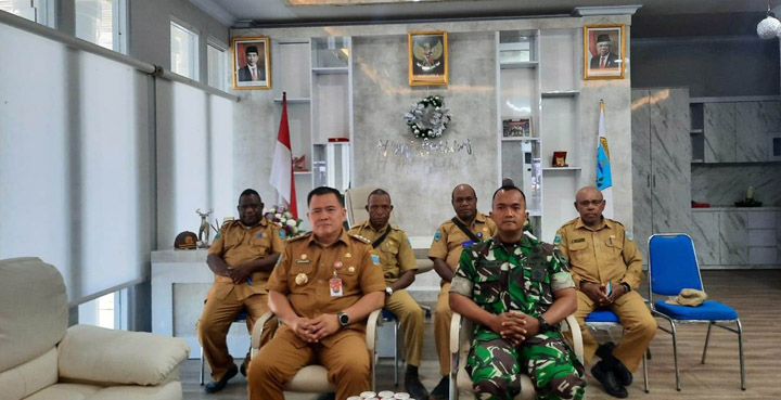 MAYBRAT,– Penjabat (Pj) Bupati Maybrat, Bernhard E. Rondonuwu bersama Dandim 1809/Maybrat, Letkol Inf Yohanis Andi Wibowo mengikuti video konferensi bersama Kementerian Pertahanan (Kemenhan), Selasa (31/1/2023).