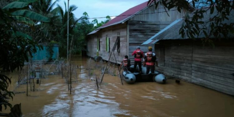 Evakuasi warga terdampak banjir bersama Basarnas, aparat desa, warga dan pihak kecamatan.