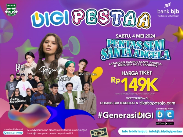 BANDUNG,– Bank bjb mendukung penuh kehadiran DIGI Pentas Seni Santa Angela (DIGI PESTAA), yang digelar SMA Santa Angela Bandung. Event yang akan memadukan seni dan teknologi transaksi digital, digelar Sabtu (4/5/2024), acara ini akan berlangsung di Lapangan Kampus Santa Angela, Jl. Merdeka No. 24, Bandung.
