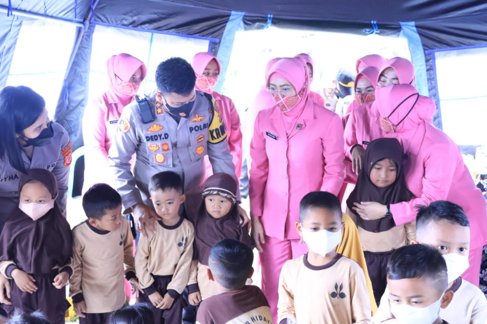 ” Hari ini saya datang ke sini selain untuk mengantar bantuan kepada para korban, juga dalam rangka menghibur anak-anak yang mengalami trauma akibat gempa,” ungkap AKBP Dedy Darmawansyah didampingi Ny. Hesti Dedy.