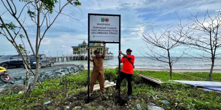 Tanah Bumbu — Bangun Kewaspadaan, Badan Penanggulangan Bencana Daerah (BPBD) Kabupaten Tanah Bumbu (Tanbu) pasang tanda peringatan banjir pesisir (ROB).