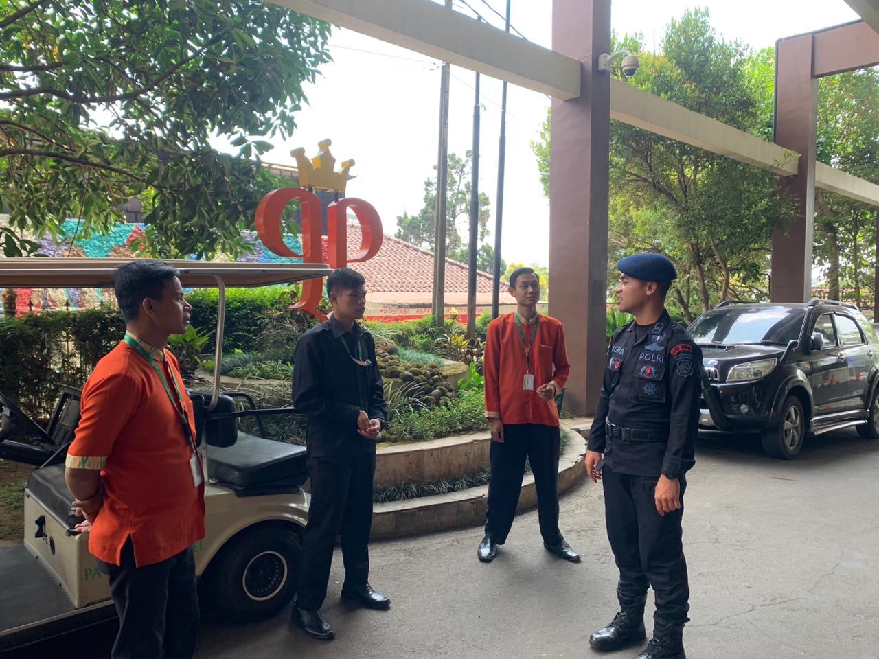 Pelaksanaan patroli tersebut Bripda Rastafara Agra menyambangi pos Security Hotel Palace dan melakukan dialogis dengan petugas Security hotel menyampaikan pesan Kamtibmas dan penyuluhan.