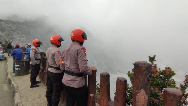 Personil Anggota Kompi 2 Batalyon B Pelopor SatBrimob Polda Jabar Dipimpin oleh Aiptu Joko Melaksanakan Patroli ke Wisata gunung Tangkuban Perahu untuk mengecek langsung situasi gunung tersebut .