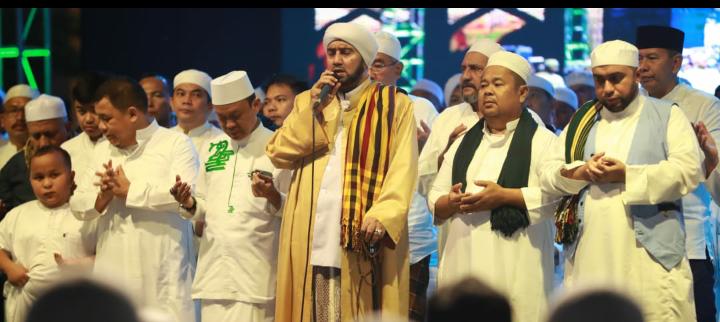 Tampak ribuan warga bersholawat dan memanjatkan doa dalam rangkaian acara Tanah Bumbu Bersholawat bersama Habib Syech.