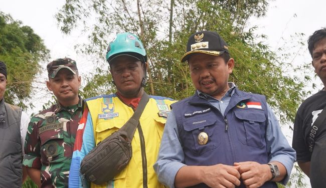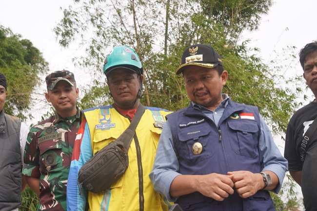 SUMEDANG, — Bupati Sumedang, H. Dony Ahmad Munir didampingi Sekretaris Daerah Tuti Ruswati beserta kepala perangkat daerah terkait memantau langsung proses pengerukan sampah di Sungai Cimande, tepatnya di bawah Jembatan Pangsor Cimanggung, Rabu (19/3/2025).