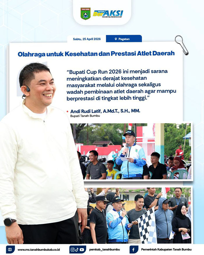 TANAH BUMBU, – Pemerintah Kabupaten Tanah Bumbu (Pemkab Tanbu) kembali menegaskan komitmennya dalam mendorong gaya hidup sehat sekaligus pengembangan prestasi olahraga melalui penyelenggaraan Bupati Tanah Bumbu Cup Run 5K 2026. Kegiatan ini berlangsung meriah di Pagatan, Kecamatan Kusan Hilir, dengan diikuti ratusan peserta dari berbagai kalangan, Sabtu (25/04/2026).