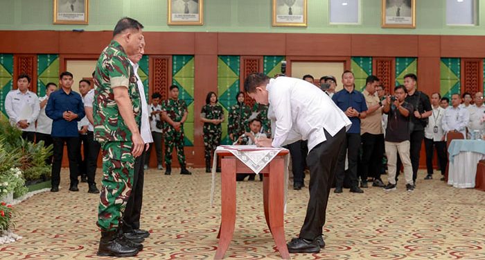 TANAH BUMBU, – Bupati Tanah Bumbu, H. Andi Rudi Latif, A.Md.T., S.H., M.M., menandatangani Kesepakatan Bersama antara Pangdam XXII Tambun Bungai dan Gubernur Kalimantan Selatan mengenai Pembangunan Markas Komando Daerah Militer (Makodam).