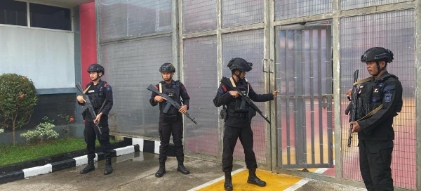 Anggota Brimob Polda Jabar yang berjaga disana melaksanakan Patroli area Lapas membantu mengawasi setiap tamu yang datang ke Lapas yang diperiksa dengan ketat oleh petugas Lapas.