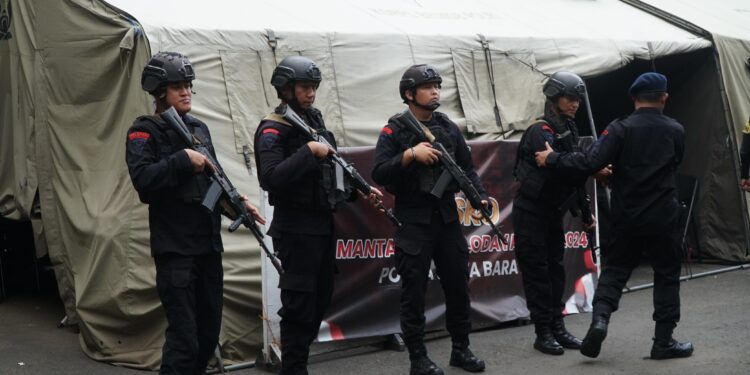 Bandung – Selasa (27/02/2024) Komandan Satuan Brimob Polda Jabar Kombes Pol. Donyar Kusumadji, S.I.K., pimpin langsung pasukan Brimob Polda Jabar dalam pengamanan aksi unjuk rasa di depan kantor Bawaslu Jabar.