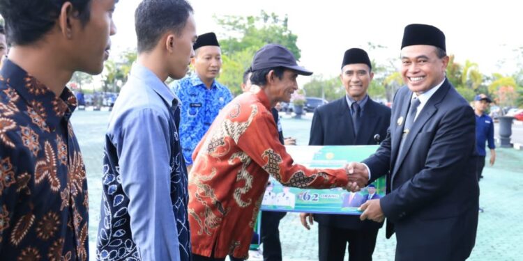 Tanah Bumbu — Pemerintah Kabupaten Tanah Bumbu (Pemkab Tanbu) menyerahkan hibah ternak untuk pengentasan kemiskinan ekstrem. Hibah tersebut di serahkan pada rangkaian Peringatan Hari Pahlawan, di Halaman Kantor Bupati di Batulicin, Jumat (10/11/2023).