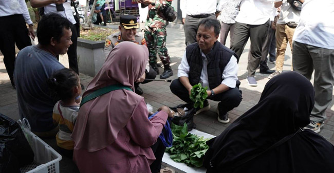 Herman Suryatman berdialog dengan penjual sayuran dan bubur sumsum usai memantau operasi pasar murah di Alun-alun Tegalkalong. Jajang menjual sayuran yang ia panen dari kebunnya sendiri.