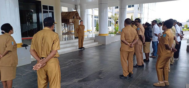 MAYBRAT,– Pj. Bupati Maybrat, Dr. Bernhard E. Rondonuwu, S.Sos., M.Si., memimpin apel pagi yang dihadiri seluruh pegawai, di kantor Bupati Maybrat, Selasa (23/7).