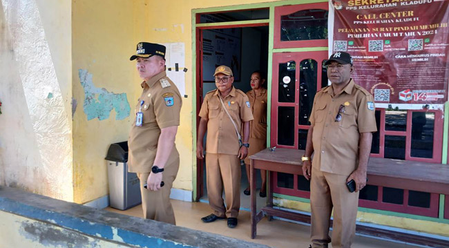 SORONG,– Penjabat (Pj) Wali Kota Sorong, Dr. Bernhard E. Rondonuwu, S.Sos., M.Si meninjau kondisi Kantor Kelurahan Kladufu, Selasa (3/12).