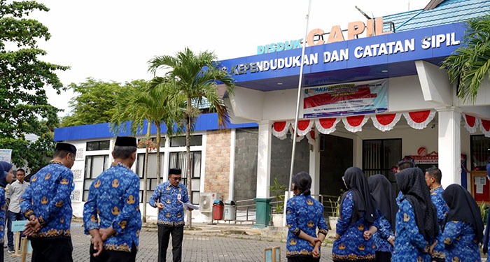 TANAH BUMBU, – Dinas Kependudukan dan Pencatatan Sipil (Disdukcapil) Kabupaten Tanah Bumbu melaksanakan apel pagi sekaligus pemenuhan penilaian Zona Integritas (ZI) sektor layanan publik, sebagai bagian dari upaya peningkatan predikat dari WBK (Wilayah Bebas dari Korupsi) menuju WBBM (Wilayah Birokrasi Bersih dan Melayani), bertempat di Gunung Tinggi, Batulicin, pada Rabu, 17 Desember 2025.