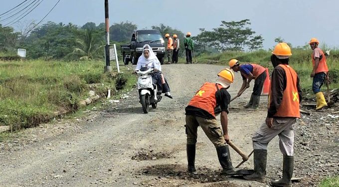 Ruas jalan penghubung Sumedang-Tanjungkerta-Buahdua ini rusak dan diperbaiki sepanjang 700 meter dengan anggaran mencapai Rp 1 miliar.
