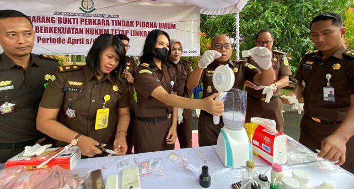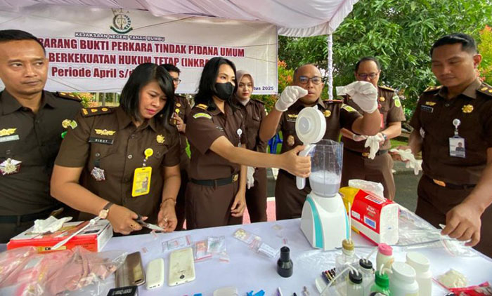 TANAH BUMBU, – Kejaksaan Negeri Tanah Bumbu (Kejari Tanbu) lakukan pemusanahan barang bukti yang sudah inkrah atau mempunyai kekuatan hukum tetap periode April 2025 hingga Juli 2025.