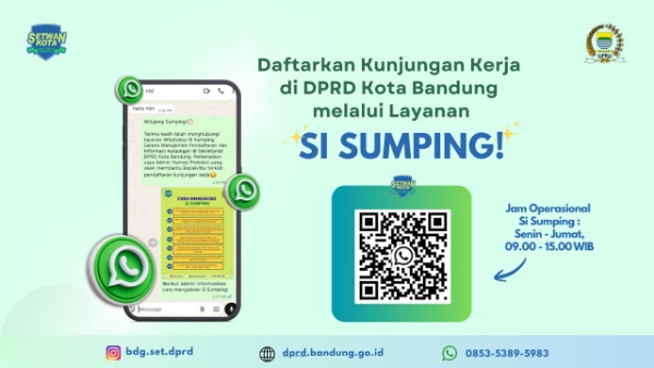 BANDUNG,- Dalam rangka meningkatkan efektivitas pelayanan, Sekretariat DPRD Kota Bandung menciptakan layanan Si Sumping. Si Sumping, Sarana Manajemen Pendaftaran dan Informasi Kunjungan, adalah sebuah layanan aplikasi percakapan dalam kanal WhatsApp untuk pendaftaran tamu kunjungan kerja di DPRD Kota Bandung.