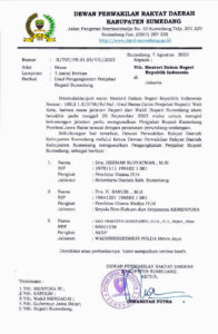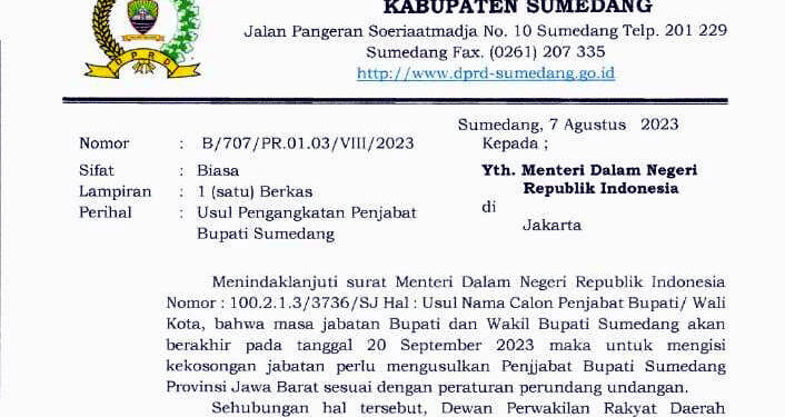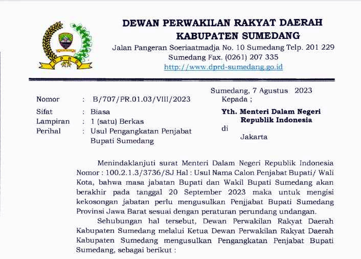 Usulan tersebut ditujukan kepada Kementrian Dalam Negeri (Kemendagri) Republik Indonesia sesuai dengan surat dari DPRD Sumedang dengan nomor B/707/PR.01.03/VIII/2023 tertanggal 07 Agustus 2023.