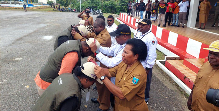MAYBRAT,— Penjabat (Pj.) Sekretaris Daerah (Sekda) Kabupaten Maybrat, Ferdinandus Taa SH., M.Si., menghadiri Apel Gerakan Coklit Serentak’ Petugas Pemutakhiran Data Pemilih (PPDP) di Alun-Alun Vaitmayat, Senin (1/7).