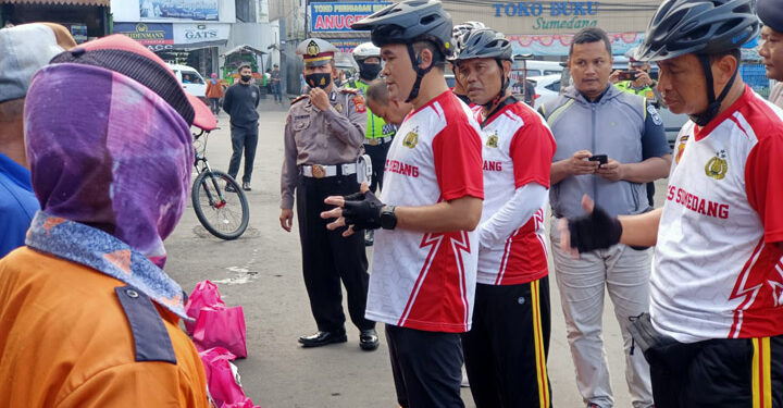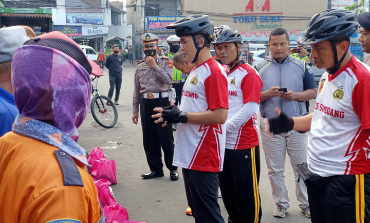 Selain Fun Bike, Kapolres Sumedang AKBP Indra Setiawan juga membagikan baksos berupa sembako kepada Ojek Ciakar, Ojek Jatihurip dan para pedagang di Taman Endog.