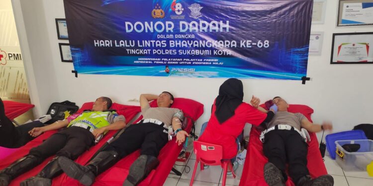 Sukabumi,-Puluhan personel Sat Lantas Polres Sukabumi Kota Polda Jabar mengikuti kegiatan bakti kesehatan donor darah di kantor PMI Kota Sukabumi, Jalan Arif Rahman Hakim Kecamatan Warudoyong Kota Sukabumi, Selasa (19/9/2023).
