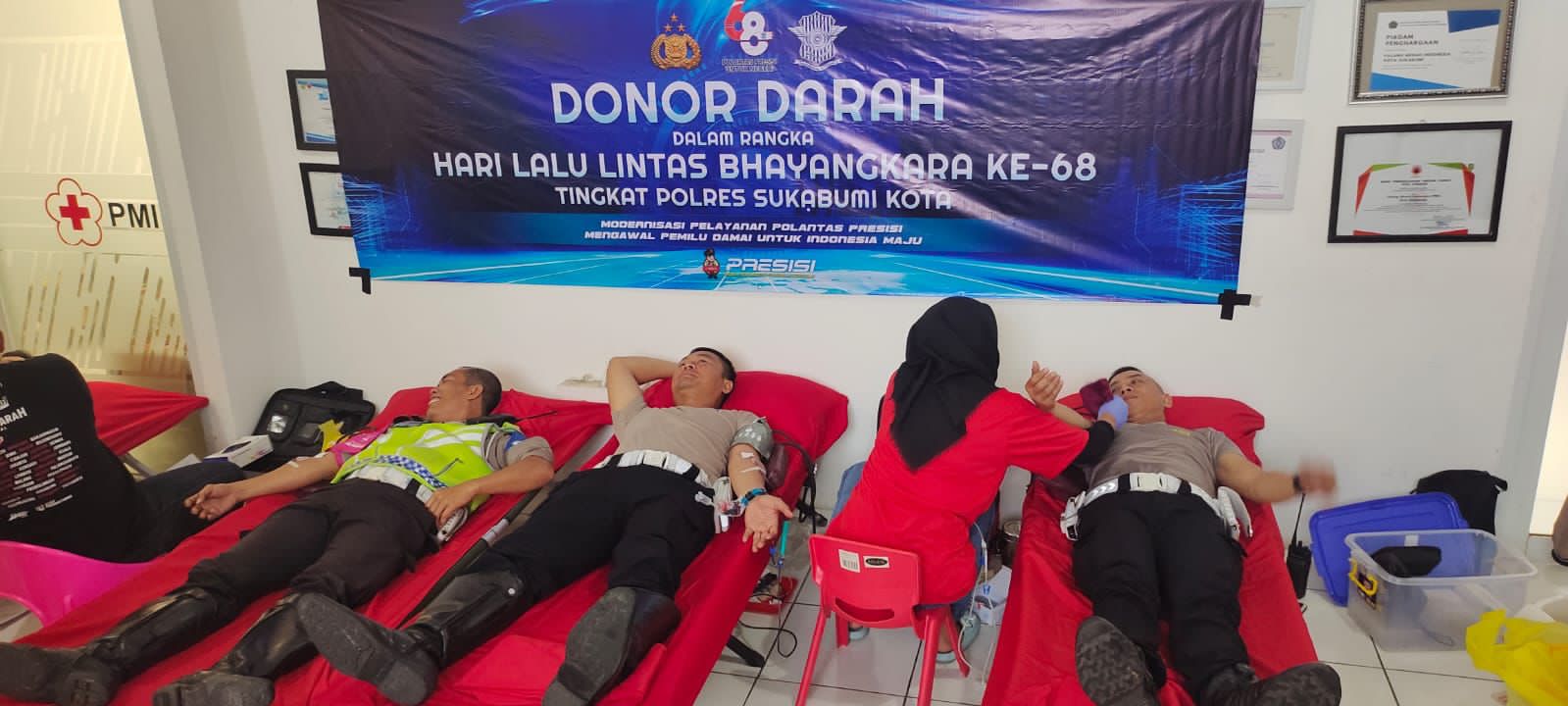 “Alhamdulilah, hari ini Sat Lantas Polres Sukabumi Kota Polda Jabar bekerjasama dengan PMI Kota Sukabumi menyelenggarakan bakti kesehatan donor darah,” ujarnya.