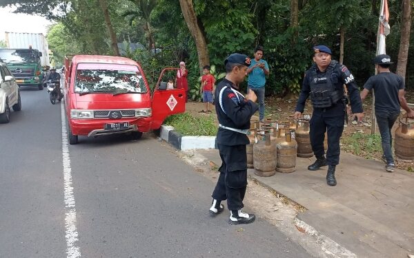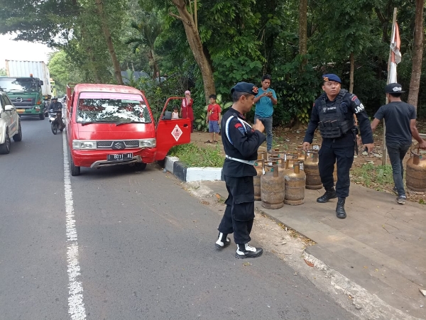 Anggota jaga membantu dan menolong material yang berantakan dipinggir jalan bungursari yang mengakibatkan kemacetan sehingga petugas dengan sigap memindahkan tabung gas.