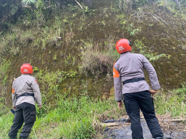 Anggota Team SAR Kompi 2 Batalyon B pelopor Sat Brimob Polda Jabar Dpp Aiptu Atep Melaksanakan patroli wilayah Lembang tepat nya di Desa Cikidang yang merupakan tempat perbukitan yang memiliki banyak sekali tebing .
