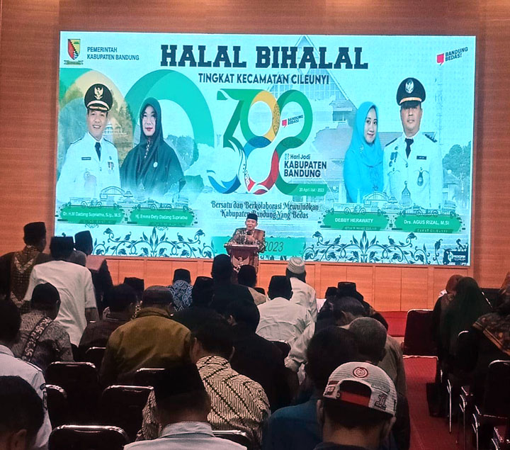 BANDUNG,– Halal bihalal Hari Raya Idul Fitri 1444 H tingkat Kecamatan Cileunyi dirangkaikan dengan hari jadi Kabupaten Bandung ke 382.
