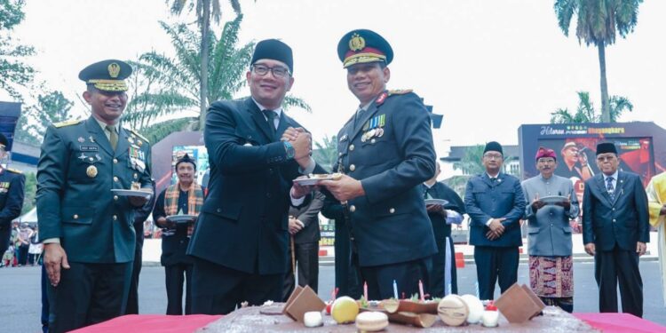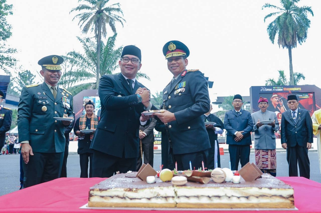 Pada kegiatan upacara dan syukuran HUT ke-77 Bhayangkara Polri, Gubernur Jawa Barat Ridwan Kamil yang menjadi inspektur upacara menyebut kehadiran Polri sebagai salah satu unsur pengawal kondusifitas bangsa menuju Indonesia Emas 2045 mendatang.
