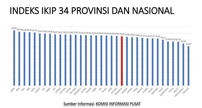 Tercatat, IKIP Jabar 2023 di atas IKIP Nasional dengan nilai 74,43 poin. Di bawah Jabar ada Riau dengan IKIP 82,43 poin; Bali 81,86; NTB 81,81; dan Aceh 81,27 poin.