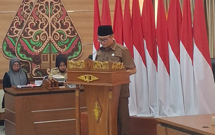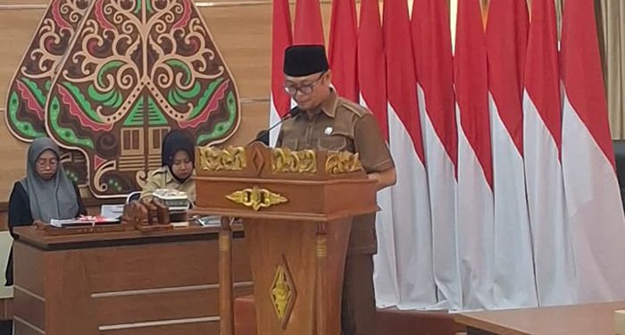 Plt Asisten Pemerintahan dan Kesra M. Putu Wisnu Wardhana menyampaikan sambutan dalam rapat paripurna PDRD Tanah Bumbu tentang pembentukan 17 desa definitive baru di tujuh kecamatan.  (Foto: Istimewa)