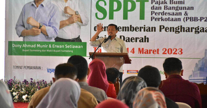 Demikian disampaikan Bupati Sumedang H. Dony Ahmad Munir pada acara penyampaian Surat Pemberitahuan Pajak Terutang Pajak Bumi dan Bangunan Perdesaan dan Perkotaan (SPPT PBB P2) Tahun 2023 di Pendopo Pusat Pemerintahan Sumedang (PPS), Selasa (14/3/2023).