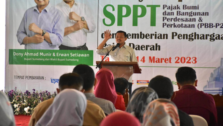 Demikian disampaikan Bupati Sumedang H. Dony Ahmad Munir pada acara penyampaian Surat Pemberitahuan Pajak Terutang Pajak Bumi dan Bangunan Perdesaan dan Perkotaan (SPPT PBB P2) Tahun 2023 di Pendopo Pusat Pemerintahan Sumedang (PPS), Selasa (14/3/2023).