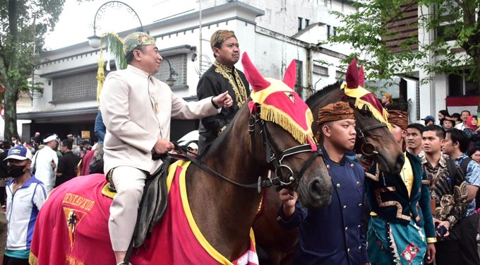 Bupati Sumedang menunggangi kuda di barisan depan, beriringan dengan Gubernur Jabar Dedi Mulyadi, Wakil Gubernur Jabar Erwan Setiawan, Sekda Jabar Herman Suryatman serta  para kepala daerah se-Jawa Barat.