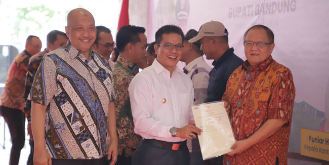 Bupati Bandung mengungkapkan bahwa Kepala Kantor Pertanahan Kabupaten Bandung hari ini melaksanakan penyerahan sertipikat tanah dan disaksikan Kepala Kantor Wilayah BPN Provinsi Jawa Barat dan Forkopimda Kabupaten Bandung.
