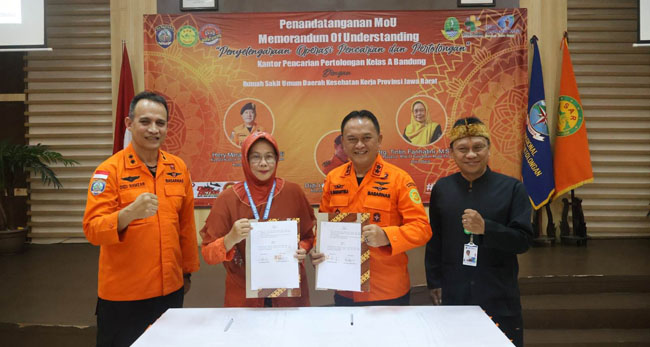 BANDUNG,– Kepala Kantor Pencarian dan Pertolongan Bandung, Hery Marantika, S.H., M.Si., bersama drg. Tintin Farihatini, M.Sc. P.H sebagai Direktur RSUD Kesehatan Kerja Jabar menandatangani nota kesepahaman atau Kerjasama.