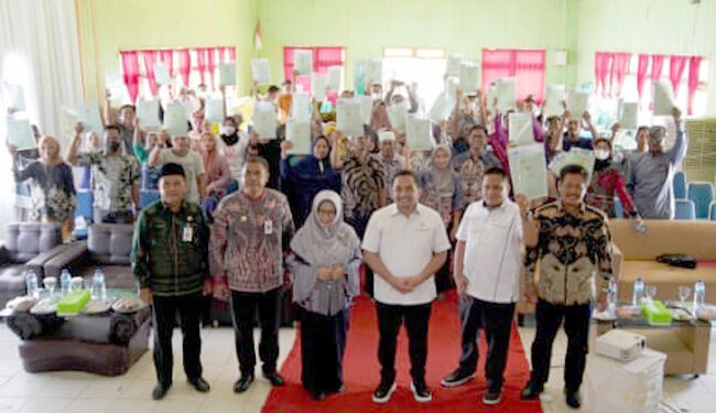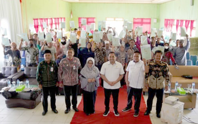 TANAH BUMBU, — Kantor Pertanahan Kabupaten Tanah Bumbu (Tanbu) menyerahkan sertifikat tanah dari program Pendaftaran Tanah Sistematis Lengkap (PTSL) untuk warga Desa Api Api, Beringin, Pagaruyung dan Tanete di wilayah Kecamatan Kusan Hilir, Kab. Tanbu.