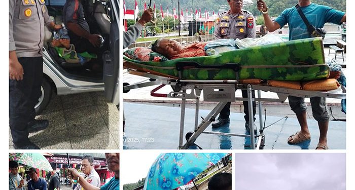 BITUNG, — Kapolsek Lembeh Selatan, IPDA John Marisi, SH, menunjukkan aksi kemanusiaan saat membantu evakuasi seorang lansia perempuan berusia 80 tahun lebih yang sakit di Kelurahan Lirang, Kecamatan Lembeh Utara, Kota Bitung, Kamis (21/08/2025).