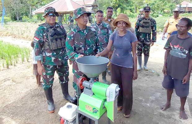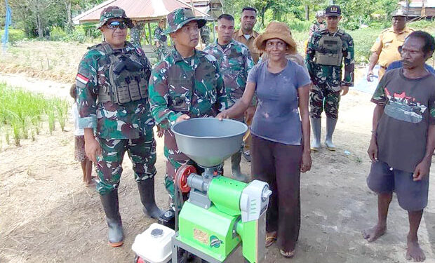 MAYBRAT,– Sebagai bagian dari Program TNI Manunggal Membangun Desa (TMMD) ke-119, Dandim 1809/Maybrat, Letkol Inf. Yoannes Andy Wibowo, bersama Satgas Yonif 133/Yudha Sakti menyalurkan bantuan alat giling padi kepada kelompok tani Faankahrio di Kamundan, Selasa (27/2/2024).