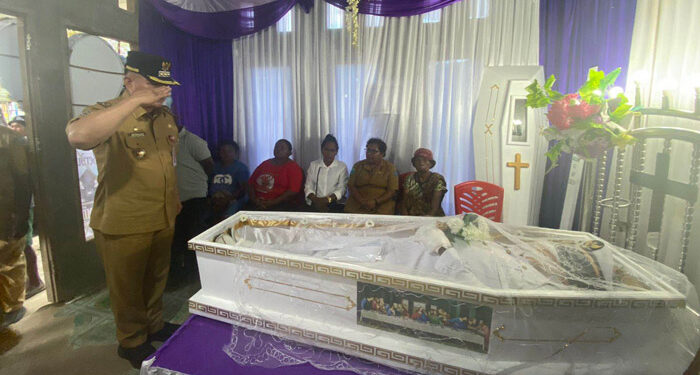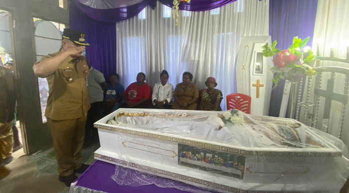 MAYBRAT,– Pj. Bupati Maybrat, Bernhard E. Rondonuwu bersama dengan Kepala Dinas P dan P, Kepala Dinas PU dan Kepala Bapeda Pemkab Maybrat melayat ke rumah duka Kepala Distrik Aitinyo Utara, Abner Asmuruf SE yang aktif menjabat, Senin (3/7/2023).