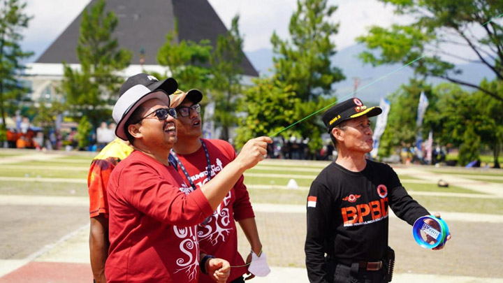 Bupati Dony Ahmad Munir, Wakil Bupati Erwan Setiawan dan Kapolres Indra Setiawan tampak asyik main layang-layang setelah sebelumnya mengikuti tarik tambang bersama perwakilan unsur Forkopimda.